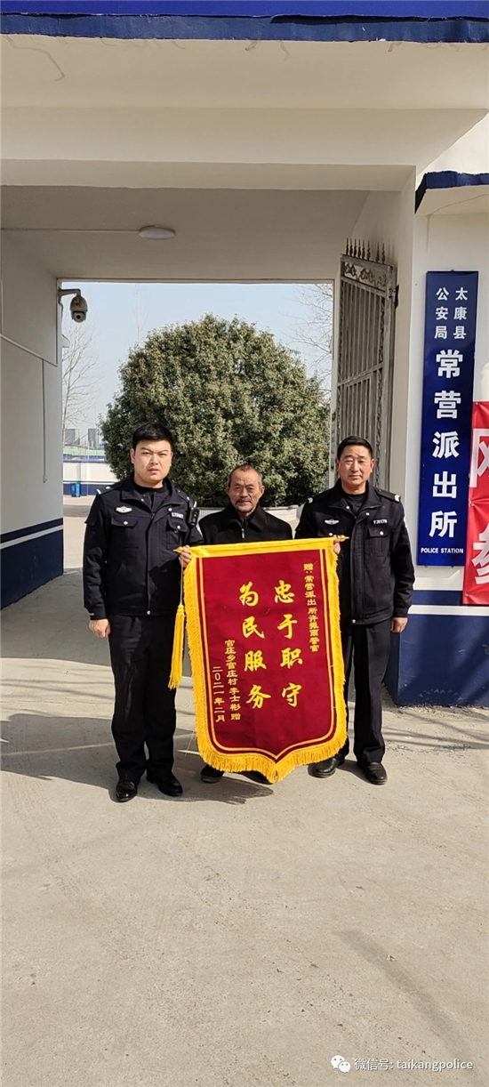 “謝謝民警同志,要不是你們的幫助,我這一年的打工所得就‘泡湯’啦!”2月2日12時許,太康縣一名老人來到該縣常營派出所,把一面寫有“忠于職守為民服務(wù)”的錦旗送到民警許振雨手中。