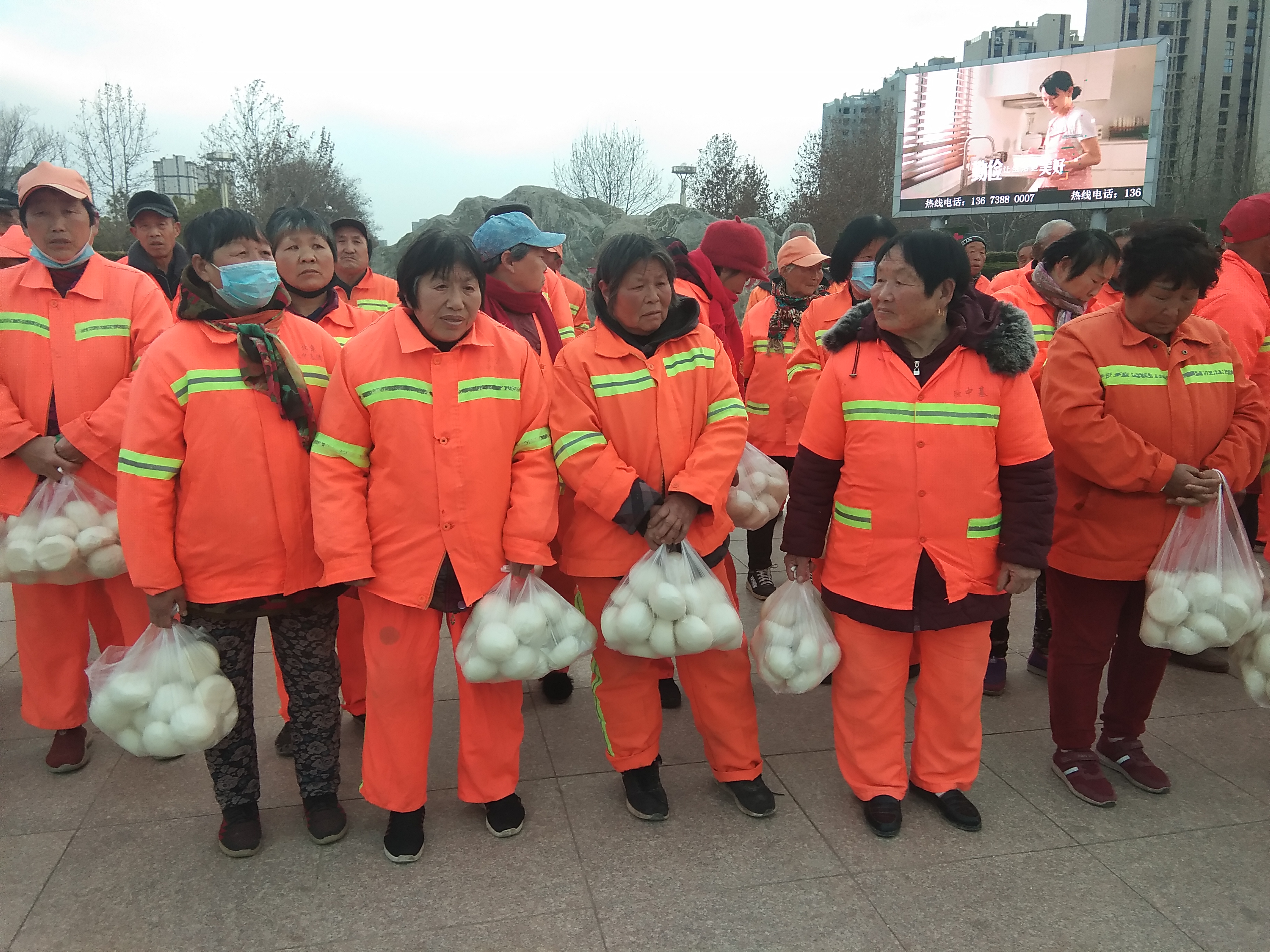 當(dāng)日下午5時許,胡環(huán)等30余名環(huán)衛(wèi)工人來到川匯區(qū)廣場,周口市家庭教育學(xué)會工作人員依次為他們送上過年饅頭,拿到饅頭的環(huán)衛(wèi)工人臉上樂開了花。