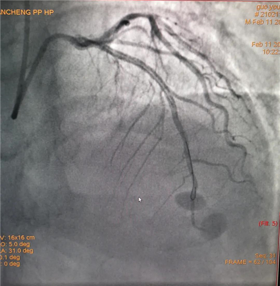 除夕,郭先生無明顯誘因突發(fā)胸痛,120急救人員到達現(xiàn)場,心電圖顯示:竇性心律完全性束支傳導(dǎo)阻滯。信息立刻發(fā)送到胸痛中心介入微信群中,心內(nèi)科值班醫(yī)生初步診斷為急性廣泛前壁心肌梗死,必須盡快進行急診支架治療,開通血管。值班醫(yī)生電話指導(dǎo)院前治療,并立即啟動胸痛綠色通道,24小時備班的介入治療團隊立即到位,9:30患者被送到導(dǎo)管室行冠脈介入診療,9:40急診PCI手術(shù)隨之開始,冠脈造影檢查提示左前降支閉塞,植入支架,堵塞的血管被順利打通,患者癥狀緩解,手術(shù)非常成功,10:20患者被送往病房進一步治療。