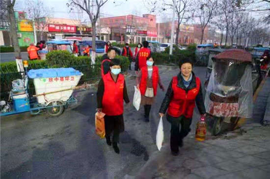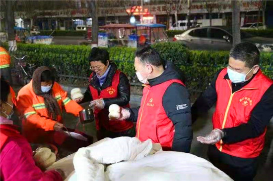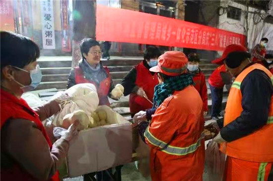 當(dāng)日早上5時,在愛心粥屋里,示范區(qū)分局的志愿者們穿著紅馬甲,戴上口罩,立即進(jìn)入忙碌狀態(tài),大家既分工明確又相互配合,現(xiàn)場井然有序。他們?yōu)榄h(huán)衛(wèi)工人盛飯端菜,拿雞蛋饅頭,動作迅速,熱情周到,有條不紊,個個忙得不亦樂乎。在這個清冷的早晨,因?yàn)橛辛藷釟怛v騰的飯菜和志愿者忙碌的身影,環(huán)衛(wèi)工人開心地笑容,感受到濃濃暖意。