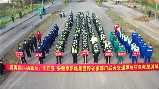 為進一步健全完善涉及危險品運輸車事故應(yīng)急處置和搶險救援機制,加強省際國省道安全管控,提高突發(fā)事件應(yīng)急處置和救援能力,經(jīng)共同研究決定,3月3日上午,河南省公安廳交警總隊組織周口市公安局交通管理支隊和安徽阜陽市公安局交通管理支隊聯(lián)合兩地交警、環(huán)保、消防、施救、120急救中心等多部門在兩市交界處舉行道路交通事故應(yīng)急救援聯(lián)合演練,演練內(nèi)容包括接處警、交通管制、環(huán)境監(jiān)測、營救被困人員、處置?;?、事故現(xiàn)場勘察、事故現(xiàn)場清理等內(nèi)容。