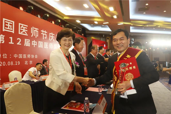 圖為:2020年8月在第十二屆中國醫(yī)師獎(jiǎng)?lì)C獎(jiǎng)典禮上接受李蘭娟院士頒獎(jiǎng)