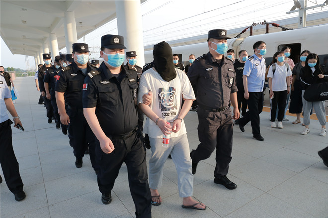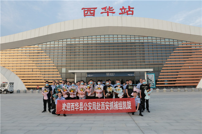 當(dāng)天,西華縣公安局在鄭阜高鐵西華站舉行歡迎儀式,迎接赴西安抓捕組凱旋歸來。特警在站臺上排列整齊、嚴(yán)陣以待,列車準(zhǔn)時停靠到站,7名犯罪嫌疑人隨即被押解下車,全副武裝的特警立即上前進(jìn)行押解交接,押往在高鐵出站口等候的裝甲車上。至此,歷經(jīng)三天三夜,一起電信網(wǎng)絡(luò)詐騙團(tuán)伙案成功告破。