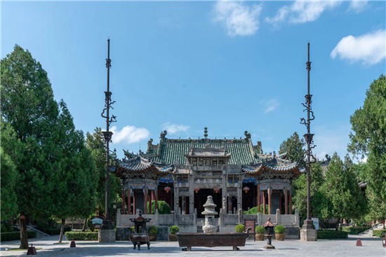 整個(gè)古建筑群為仿宮殿式,山門、鐵旗桿、石牌坊、碑亭、饗殿、大殿、河伯殿、炎帝殿、戲樓、拜殿、春秋閣由南向北,建于中軸線上,藥王殿、灶君殿和東廊房,財(cái)神殿、酒仙殿及西廊房在前院左右,東西看樓、東西配殿建在中院兩側(cè),老君殿、馬王殿、瘟神殿為東偏房,客房僧舍位于西院。是全國重點(diǎn)文物保護(hù)單位,國家AAAA級旅游景區(qū),國家三級博物館。