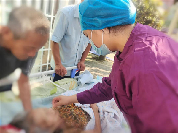 接到派單后,心血管二病區(qū)護(hù)士長(zhǎng)孫娜第一時(shí)間與患者家屬取得聯(lián)系,得知這位近百歲的老人是在凌晨一點(diǎn)多自行把胃管拔了出來(lái),早晨還沒(méi)有進(jìn)食,于是帶著護(hù)士陳珍珍第一時(shí)間趕往了患者家里。還未下車(chē),她們就看到患者家屬在門(mén)口著急地張望:“怎么這么快,太好了,我的老母親不用餓肚子了?!?/p>