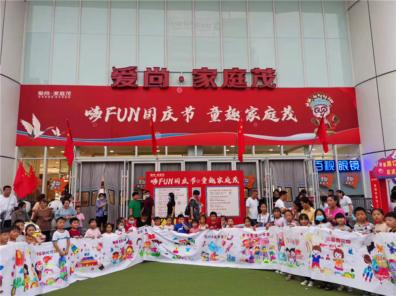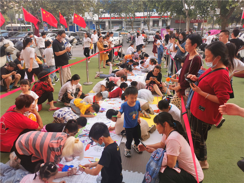 10月1日下午,在位于周口市中心城區(qū)七一路與中州大道交叉口的萬果園家庭茂商超前,近百名小朋友聚集在一起用手中的畫筆表達(dá)對(duì)祖國母親的祝福。