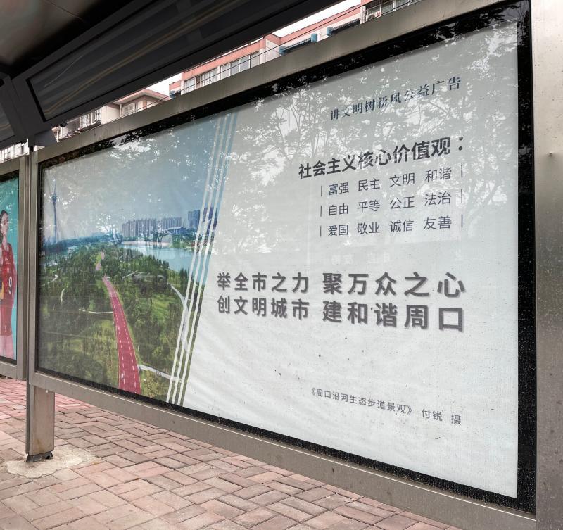 公交站臺(tái)作為城市文化傳播的符號(hào)之一,對(duì)城市形象的提升有著重要意義。10月26日,記者走訪了我市中心城區(qū)公交候車臺(tái),隨處可見的公益廣告牌引人注目,“文明與你同行,創(chuàng)建從我做起”“倡導(dǎo)文明新風(fēng)尚,爭(zhēng)做文明周口人”“舉全市之力,聚萬(wàn)眾之心,創(chuàng)文明城市,建和諧周口”,一句句文明標(biāo)語(yǔ)為周口創(chuàng)建全國(guó)文明城市增光添彩。