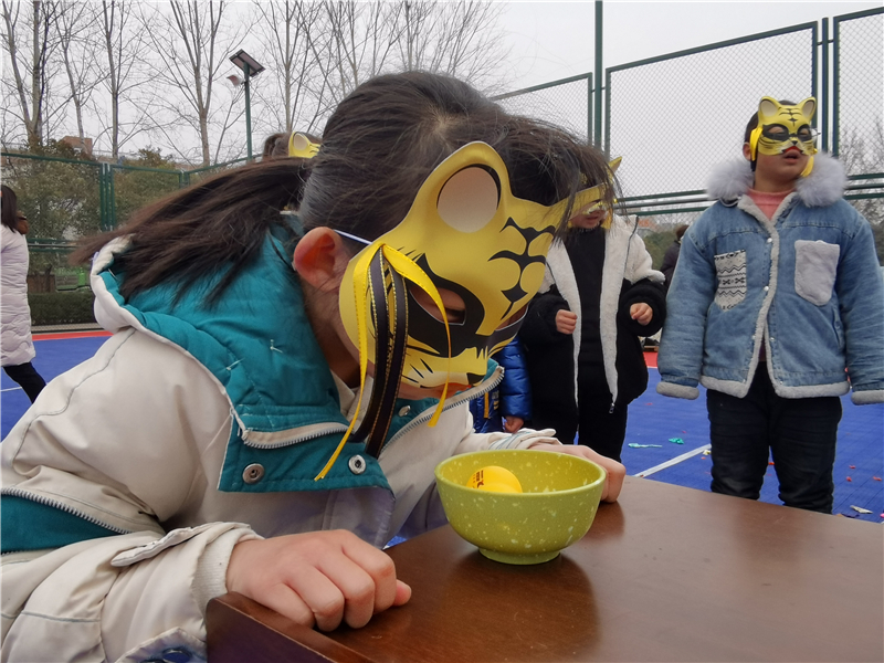 活動現(xiàn)場,一條條燈謎掛在繩上供大家思考,猜出謎底的“虎娃”開心地把燈謎撕下來找工作人員兌換獎品,玩得不亦樂乎。同時,元宵節(jié)的傳統(tǒng)食物元宵也出現(xiàn)在活動中,社工、志愿者設置的團團圓圓(歡樂夾元宵)游戲,用乒乓球代替元宵,讓“虎娃”們進行大比拼,大家從剛開始的不熟悉變?yōu)楹髞碓絹碓侥酰F(xiàn)場其樂融融。隨后,聲聲報福(踩氣球)游戲將活動推向高潮。