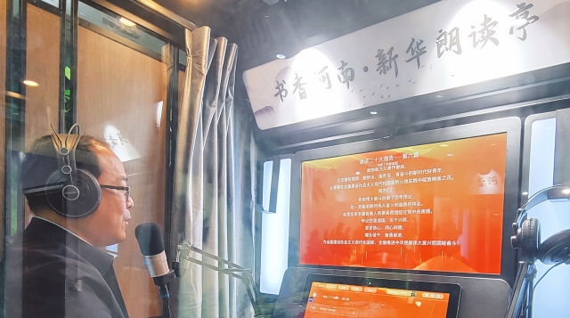 • 11月3日,在位于項(xiàng)城市商城路與西大街交叉口的新華書店朗讀亭內(nèi),誦讀愛好者年秋燕正在選讀黨的二十大報(bào)告原文,其深情且鏗鏘有力的誦讀聲令人如癡如醉。