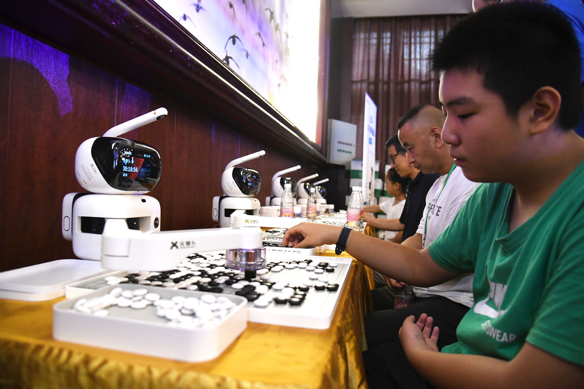 • ?8月15日上午,圍棋棋手們?cè)谫愂麻g隙,和機(jī)器人對(duì)弈,增添不少樂趣。在2023中國淮陽第二屆“荷花杯”全國業(yè)余圍棋公開賽的賽場(chǎng)邊,賽事方特意擺放五部圍棋機(jī)器人,供棋手們?cè)谫愂轮鄪蕵贰9ぷ魅藛T介紹,這些圍棋機(jī)器人很強(qiáng)大,不上網(wǎng)聯(lián)機(jī)的情況下,它們具有業(yè)余圍棋三段水平,如果上網(wǎng)聯(lián)機(jī),則具有職業(yè)九段能力,人機(jī)大戰(zhàn),棋手們未必能贏了機(jī)器人。