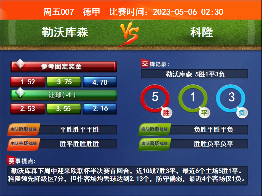 比賽時(shí)間:2023-05-06 02:30賽事提點(diǎn):勒沃庫(kù)森下周中迎來(lái)歐聯(lián)杯半決賽首回合,近10戰(zhàn)7勝3平,最近6個(gè)主場(chǎng)5勝1平。科隆領(lǐng)先降級(jí)區(qū)7分,但作客場(chǎng)均丟球達(dá)到2.13個(gè),防守偏弱,最近4個(gè)客場(chǎng)僅1負(fù)。
