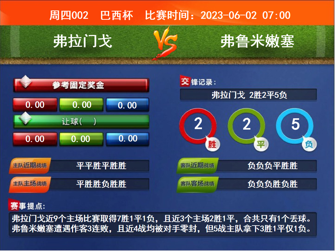 比賽時(shí)間:2023-06-02 07:00賽事提點(diǎn):弗拉門戈近9個(gè)主場比賽取得7勝1平1負(fù),且近3個(gè)主場2勝1平,合共只有1個(gè)丟球。弗魯米嫩塞遭遇作客3連敗,且近4戰(zhàn)均被對手零封,但5戰(zhàn)主隊(duì)拿下3勝1平僅1負(fù)。