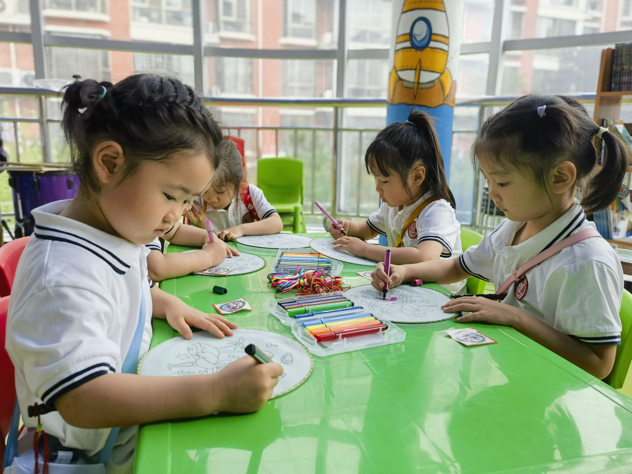 編織五彩繩是端午節(jié)的習(xí)俗之一,有祈福納吉的美好寓意;團(tuán)扇是古代扇文化的代表,有著深厚的文化底蘊(yùn)……在當(dāng)天的活動中,中原社區(qū)還邀請部分小朋友參與畫團(tuán)扇、編彩繩活動。道德文明使者給小朋友們分發(fā)了空白團(tuán)扇、顏料等,耐心地講解繪畫方法及團(tuán)扇的歷史。聽著講解,小朋友們一筆一畫在潔白的扇面上描繪出一個個色彩鮮艷的形象,一把把素面團(tuán)扇被賦予了栩栩如生的圖景,讓大家感受到了傳統(tǒng)文化的魅力。隨后,道德文明使者拿起五彩絲線,手把手教小朋友們編彩繩,讓他們感受手工藝的樂趣。“今天的活動非常有意義,我喜歡編彩繩,也喜歡畫畫?!毙∨笥褬窐罚ɑ┱f。