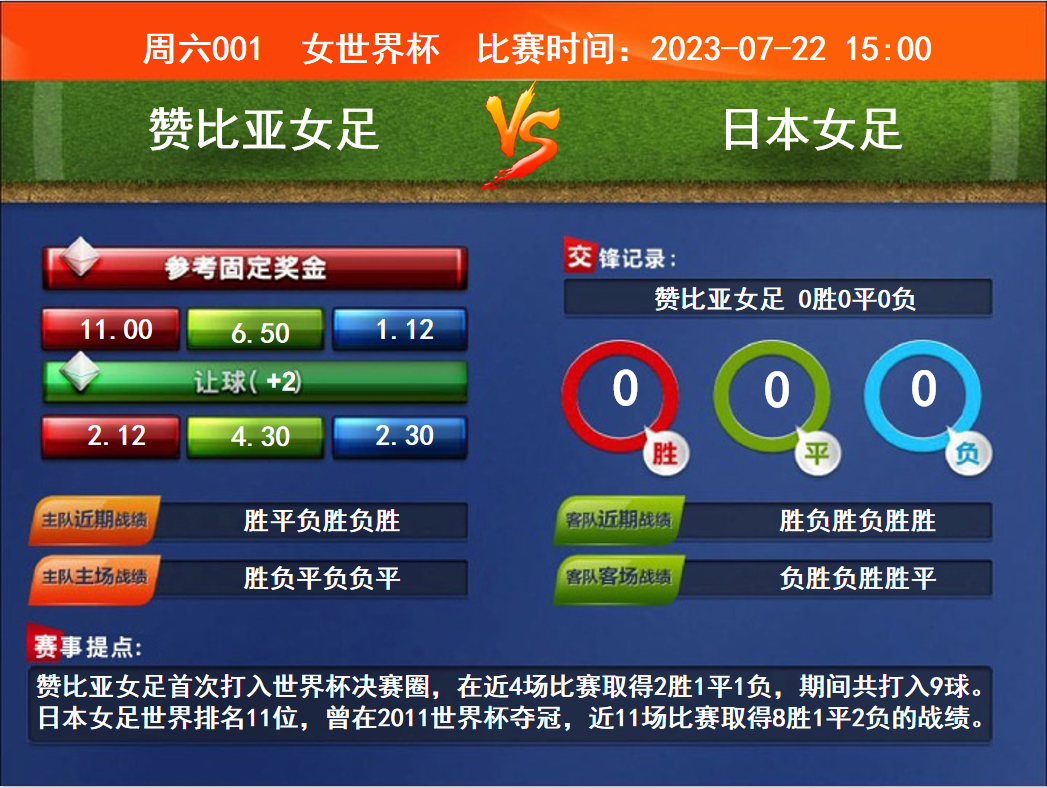 比賽時間:2023-07-22 15:00賽事提點:贊比亞女足首次打入世界杯決賽圈,在近4場比賽取得2勝1平1負,期間共打入9球。日本女足世界排名11位,曾在2011世界杯奪冠,近11場比賽取得8勝1平2負的戰(zhàn)績。