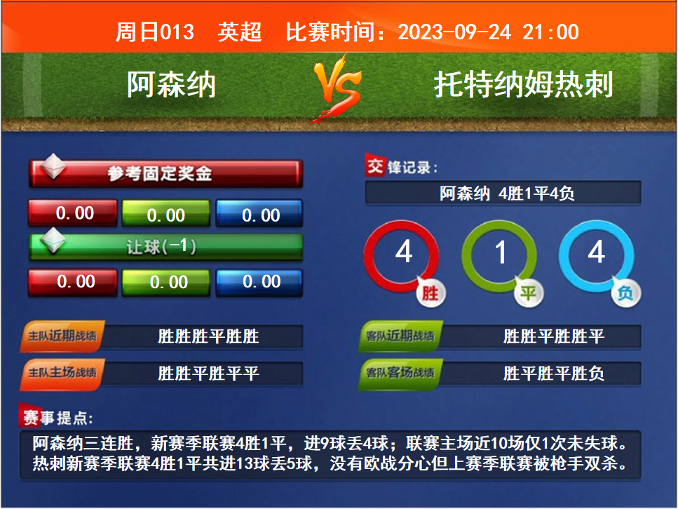 比賽時(shí)間:2023-09-24 21:00賽事提點(diǎn):阿森納三連勝,新賽季聯(lián)賽4勝1平,進(jìn)9球丟4球;聯(lián)賽主場(chǎng)近10場(chǎng)僅1次未失球。熱刺新賽季聯(lián)賽4勝1平共進(jìn)13球丟5球,沒有歐戰(zhàn)分心但上賽季聯(lián)賽被槍手雙殺。