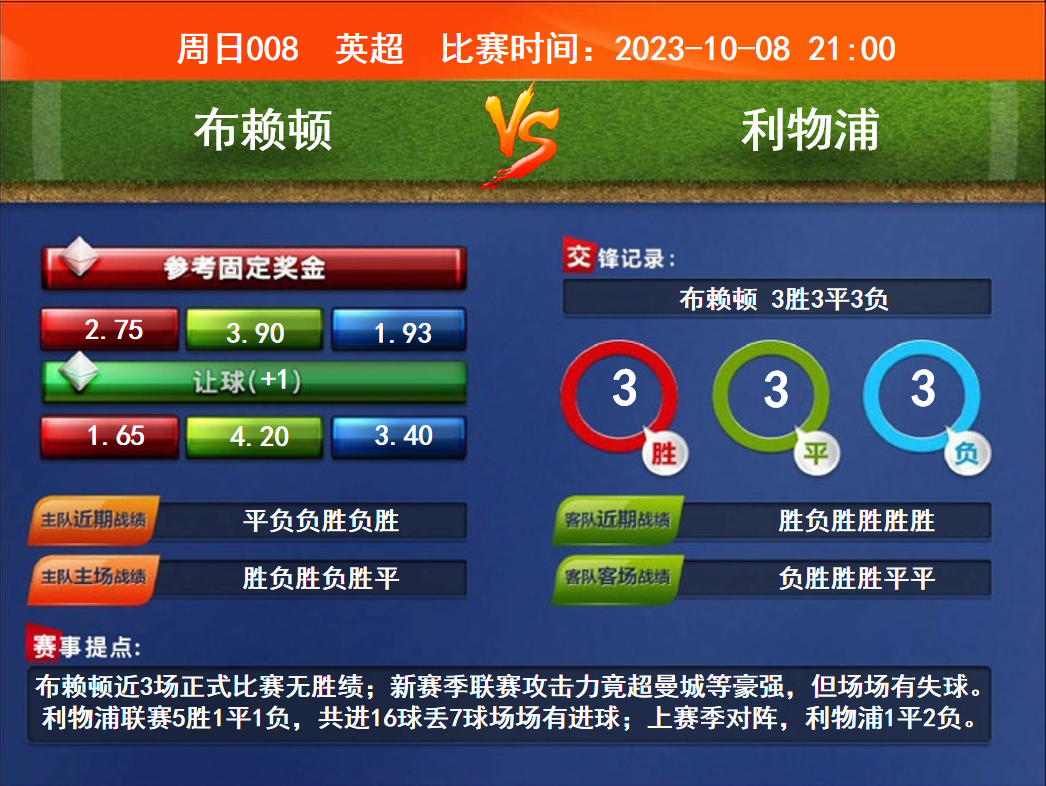 比賽時(shí)間:2023-10-08 21:00賽事提點(diǎn):布賴頓近3場(chǎng)正式比賽無(wú)勝績(jī);新賽季聯(lián)賽攻擊力竟超曼城等豪強(qiáng),但場(chǎng)場(chǎng)有失球。利物浦聯(lián)賽5勝1平1負(fù),共進(jìn)16球丟7球場(chǎng)場(chǎng)有進(jìn)球;上賽季對(duì)陣,利物浦1平2負(fù)。