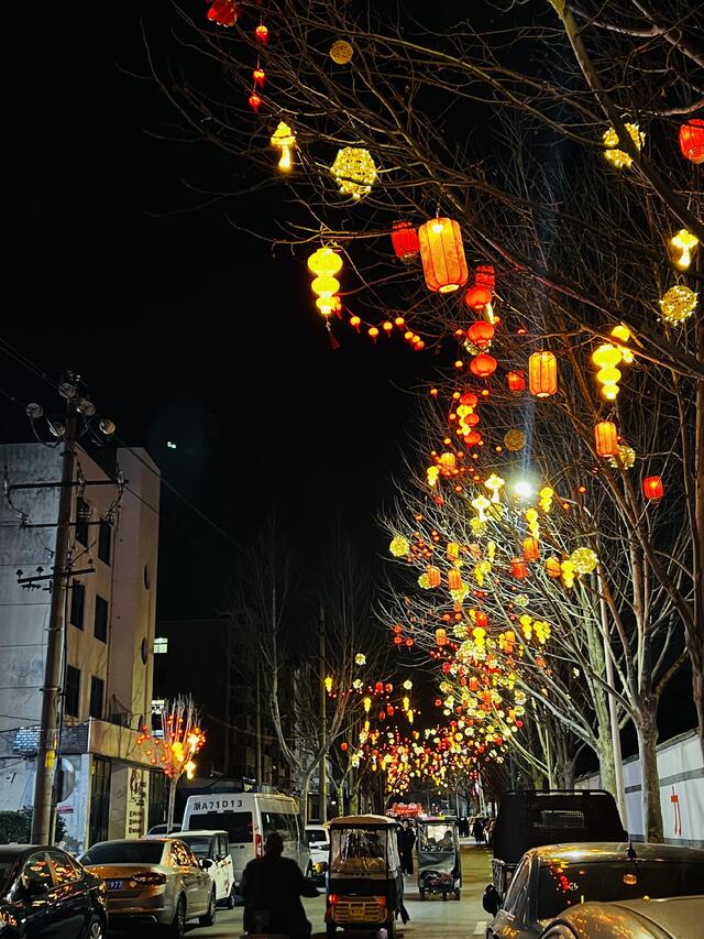 • 2月18日晚,記者在川匯區(qū)荷花路看到,路旁樹上掛滿了各式各樣的春節(jié)燈飾。紅色的燈籠沿街道綿延鋪展,金色的燈球在晚風(fēng)中輕輕搖曳,光影將這條老街的輪廓勾勒得靈動(dòng)雅致。