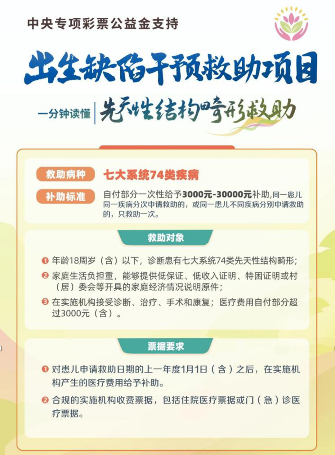 中央專項(xiàng)彩票公益金支持出生缺陷救助項(xiàng)目,旨在向患有遺傳代謝病、先天性結(jié)構(gòu)畸形和功能性出生缺陷等三類出生缺陷疾病的經(jīng)濟(jì)困難家庭提供醫(yī)療費(fèi)用補(bǔ)助,減輕患兒家庭醫(yī)療負(fù)擔(dān)。該項(xiàng)目由衛(wèi)生健康委委托中國出生缺陷干預(yù)救助基金會組織實(shí)施。