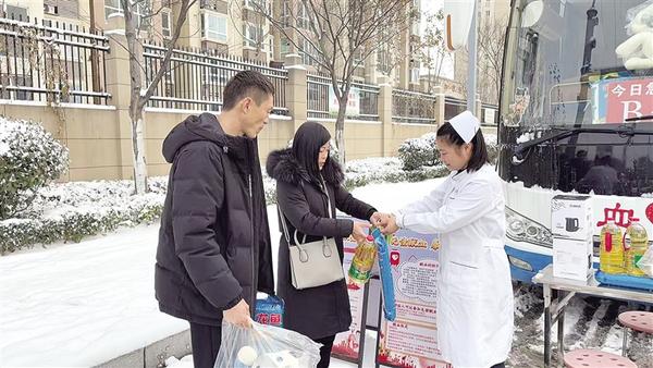 1月19日,熱心市民冒雪步行到獻(xiàn)血車無償獻(xiàn)血,以熱血守護(hù)生命。圖為市民獻(xiàn)血后領(lǐng)取無償獻(xiàn)血紀(jì)念品。