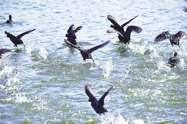 11月16日,在淮陽龍湖國家濕地公園,一群國家二級保護動物白骨頂雞在此集結(jié)。