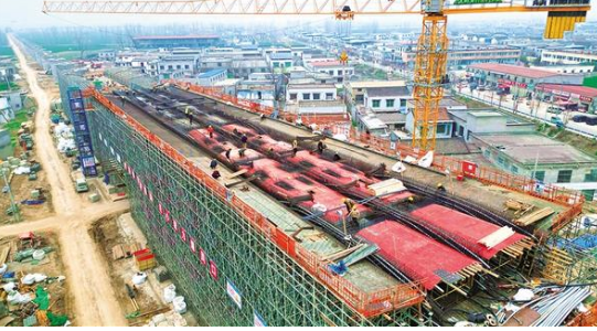 3月14日上午,中鐵十局工人在平漯周高鐵9標段工地上開展岔道連續(xù)梁施工。
