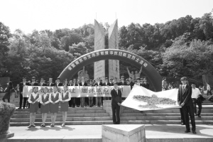 5月5日,大學生們在抗日航空烈士紀念碑前合影。