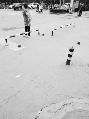 左圖   平原賓館門前的人行道不知被誰裝上了“黃杠杠”,行人只能繞行通過。
