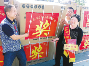 左圖  5月19日,淮陽(yáng)縣隆重表彰63戶2015年度“最美家庭”。近年來(lái),該縣依托“婦女之家”,通過(guò)召開座談會(huì)、講親情故事、曬照片等形式,大力開展尋找“最美家庭”活動(dòng),取得了良好的社會(huì)效果。圖為當(dāng)選“最美家庭”的齊國(guó)蘭高興地領(lǐng)取獎(jiǎng)品。