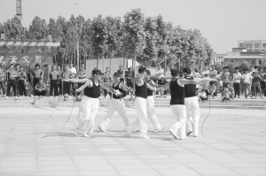 為進(jìn)一步推動(dòng)全民健身活動(dòng)的深入開展,項(xiàng)城市啟動(dòng)了“全民健身月”活動(dòng),讓市民積極投身到全民健身行列中,努力使體育鍛煉經(jīng)?;€(gè)人健身生活化。圖為5月18日項(xiàng)城市鞭陀協(xié)會(huì)的會(huì)員正在進(jìn)行鞭陀健身展演。
