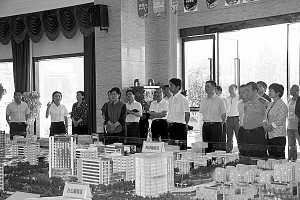 羅文閣在商務(wù)中心區(qū)規(guī)劃沙盤前聽取項目進展情況匯報。丁宇濤 攝