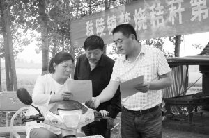 項(xiàng)城市秣陵鎮(zhèn)積極做好夏季秸稈禁燒工作,實(shí)行班子成員包片、機(jī)關(guān)干部包村、村組干部包戶責(zé)任制,全力構(gòu)筑了秸稈禁燒“防火墻”。圖為6月8日該鎮(zhèn)干部在李閣村向過(guò)往群眾發(fā)放禁燒宣傳單。(張永久 攝)