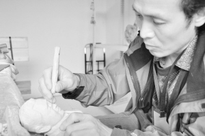 ▲新鄉(xiāng)木雕技藝傳承人劉玉洲現(xiàn)場雕刻一名游客的頭像。