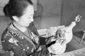 ▲南陽烙畫第五代傳承人曹艷紅在葫蘆上制作烙畫。