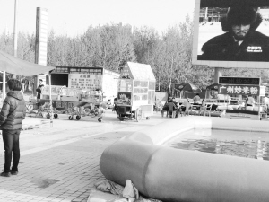 4月8日18時許,記者在現(xiàn)場看到,廣場的中央噴泉東側(cè)擺了許多攤點(diǎn),有的攤點(diǎn)甚至把桌椅擺到了人行道上(如圖)。在廣場東側(cè)的出入口處,一些賣飯的商販已經(jīng)將桌椅擺放整齊,不寬的道路被占去近一半。
